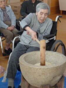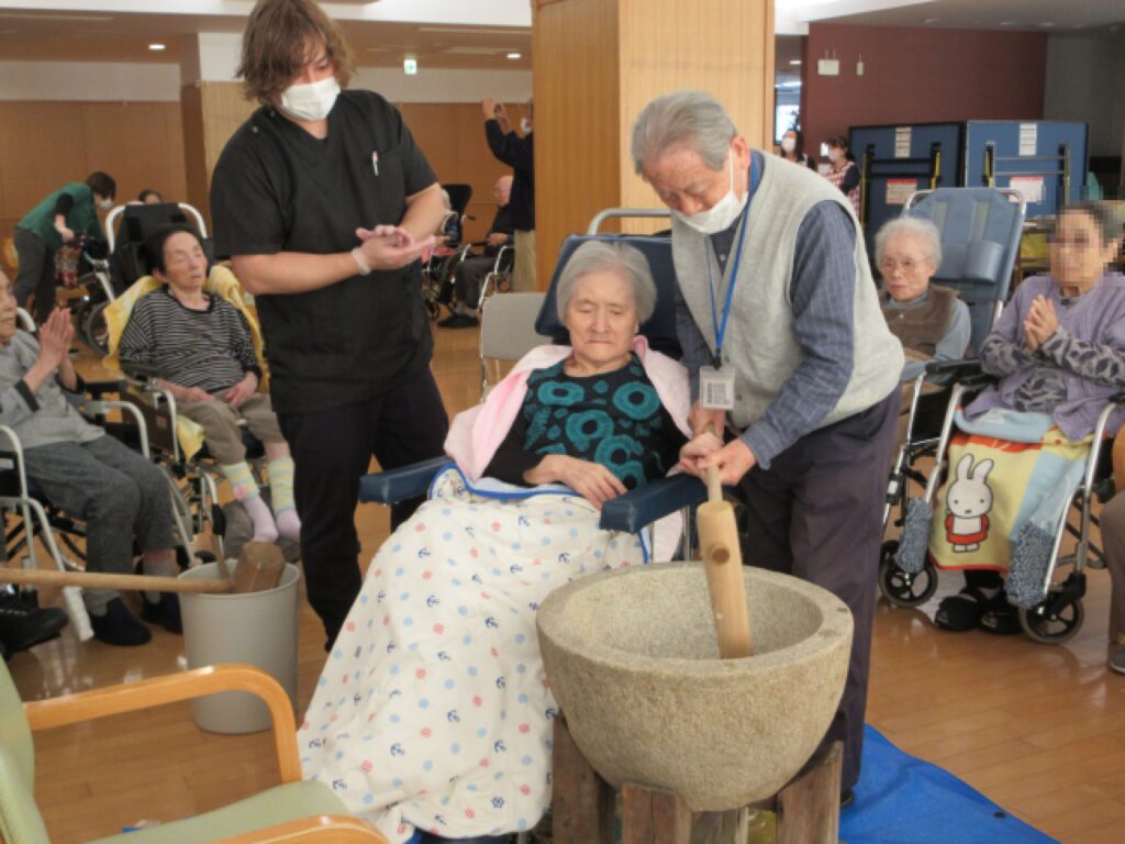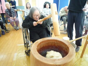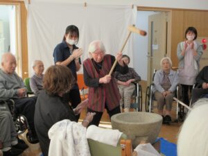朝からなんだか施設全体が落ち着かない雰囲気。「杵、重いかな?」「ちゃんと持ち上がるかな?」と、まるで体育祭の選手宣誓前のランナーのように、皆様ソワソワ。お互いに「大丈夫?」「いや、あなたの方が心配よ!」と、エールを送り合う様子にスタッフもほっこり。