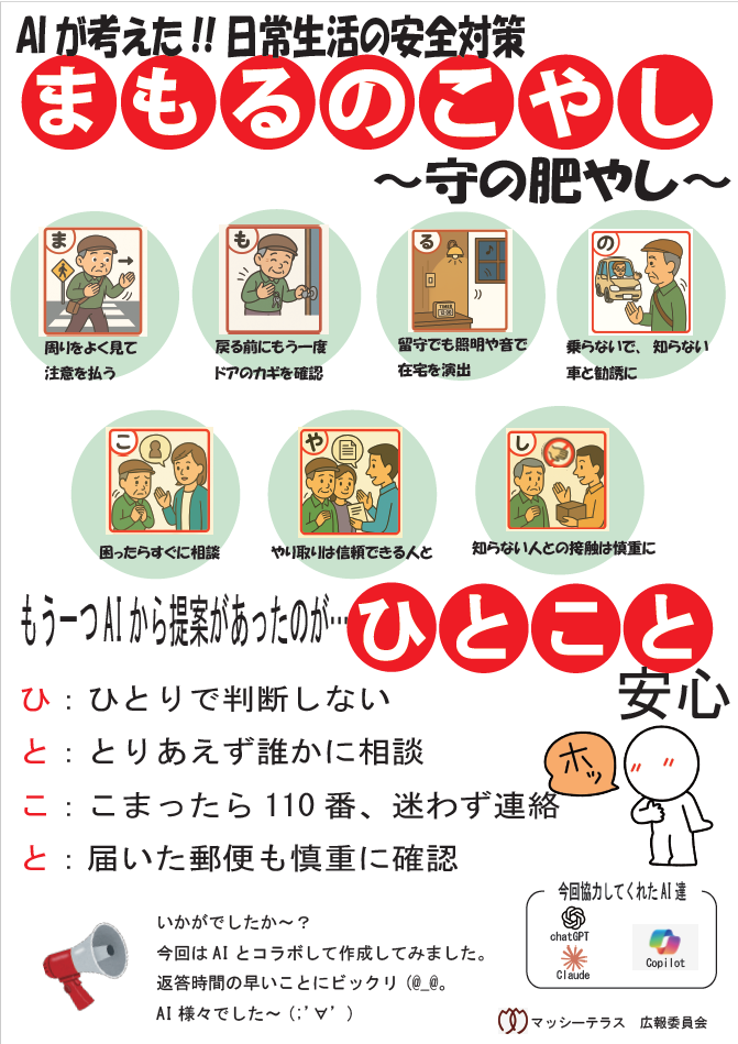 まず目を引くのが、AIが考案したというユニークな防犯語呂合わせ 「まもるのこやし(守の肥やし)」。 紙面には「周りをよく見て注意を払う」や「戻る前にもう一度ドアのカギを確認」といった、日常の中でつい油断しがちなポイントが丁寧にまとめられています。これらは実際に紙面にも記載されているフレーズで、AIが提案した防犯意識の“肥やし”として紹介されています。