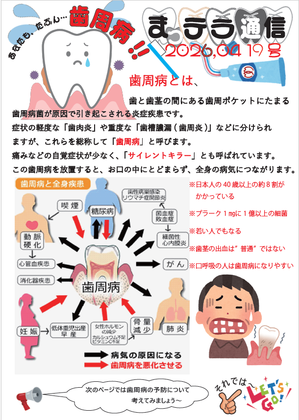 いつも当施設のブログをご覧いただきありがとうございます。 このたび まっテラ通信19号 を発行いたしました。今回のテーマは、私たちの健康に深く関わる 「歯周病」 です。