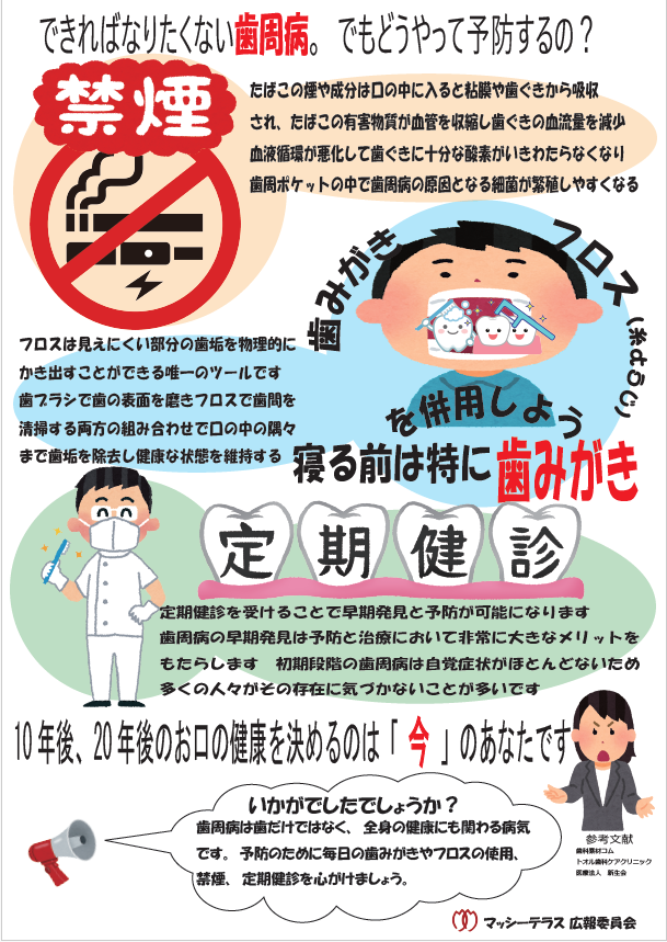 歯周病は、正しい知識と日々のケアでしっかり予防できる病気です。 まっテラ通信19号を通して、皆さまの健康づくりに少しでもお役に立てれば幸いです。