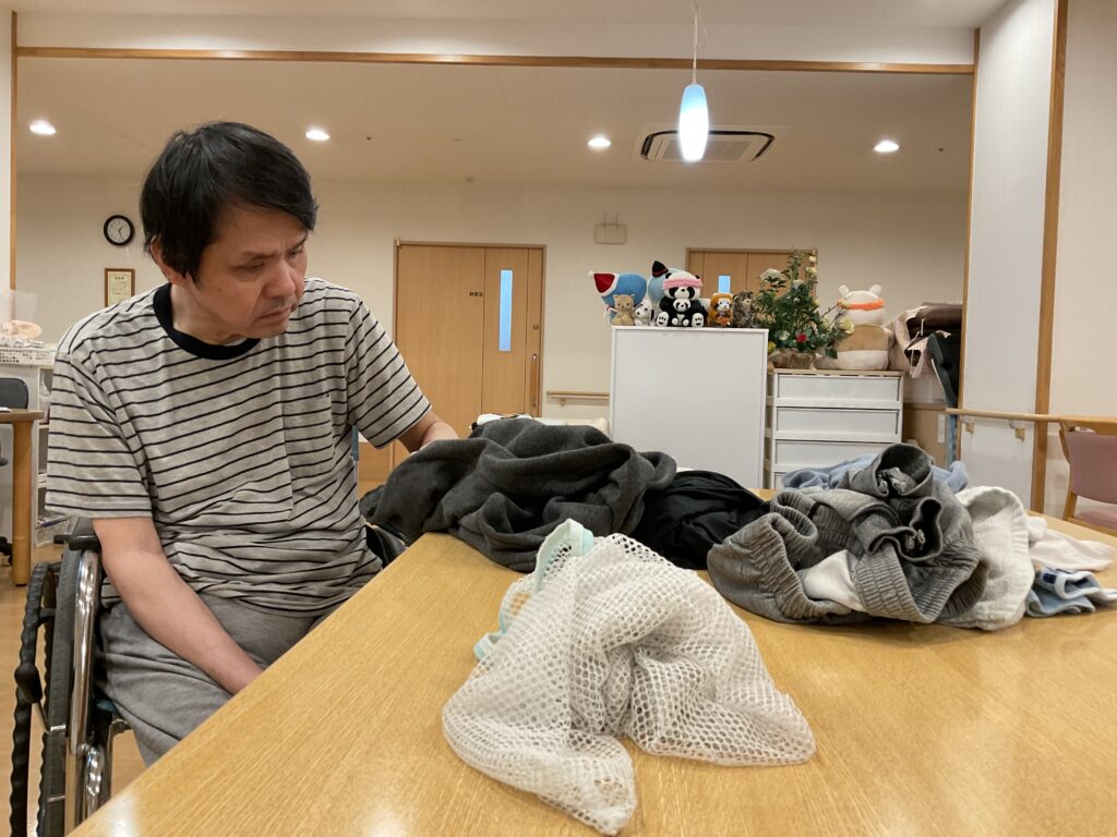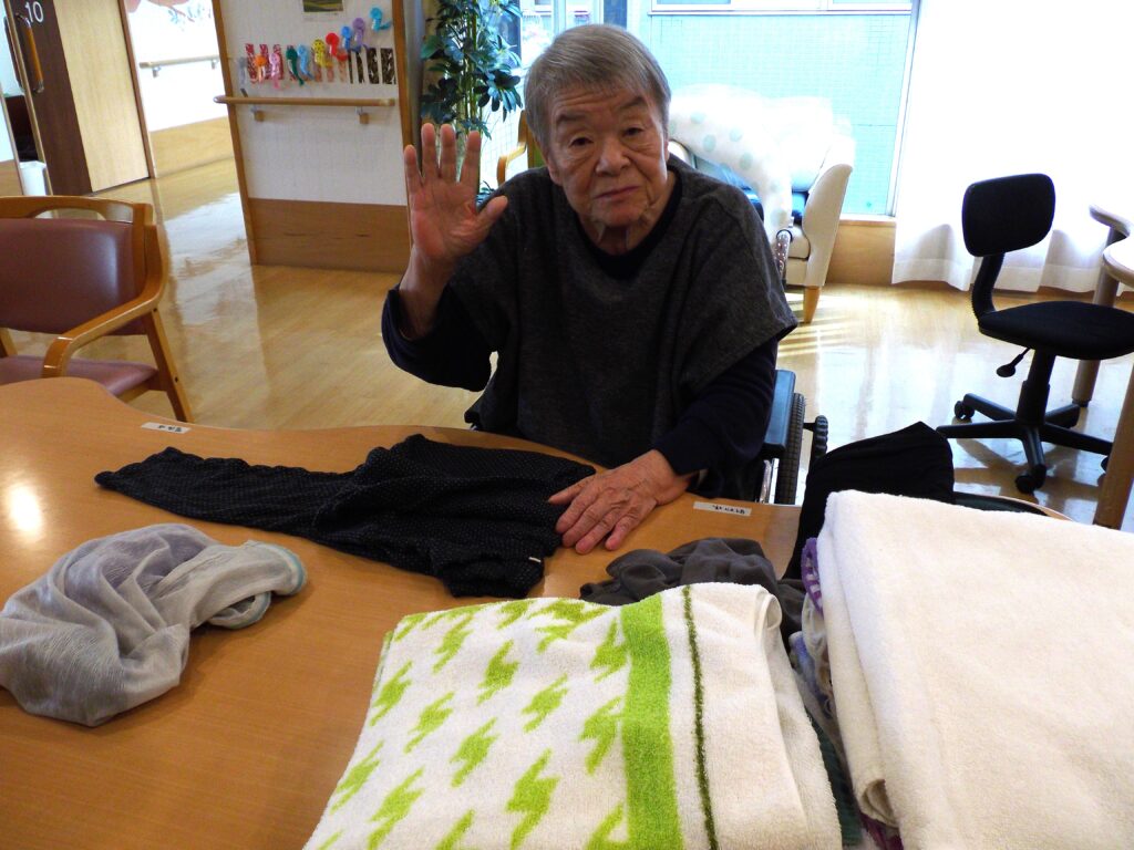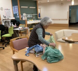 マッシーテラスでは、各階・フロアに“洗濯物たたみの名人”がいらっしゃいます。洗濯物が届くと自然と手が動き、丁寧にきれいにたたんでくださる姿はまさに職人技。長年の暮らしの中で培われた手際の良さに、職員も思わず感心してしまいます。