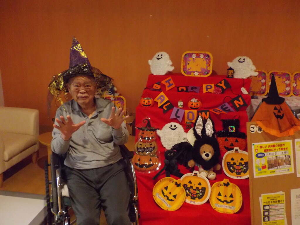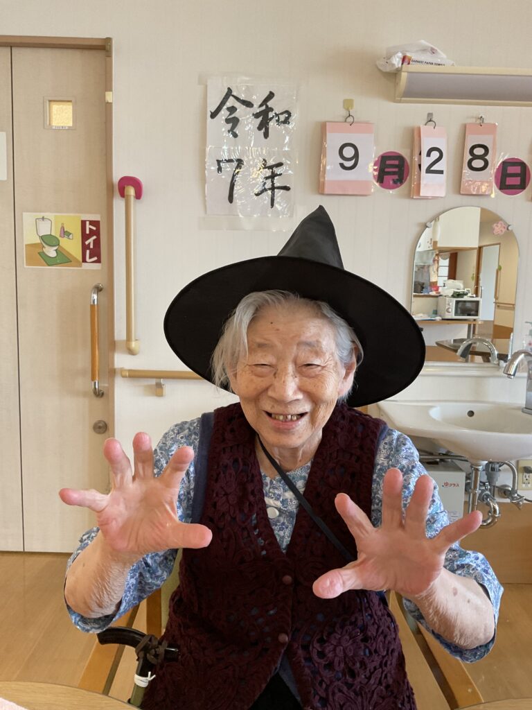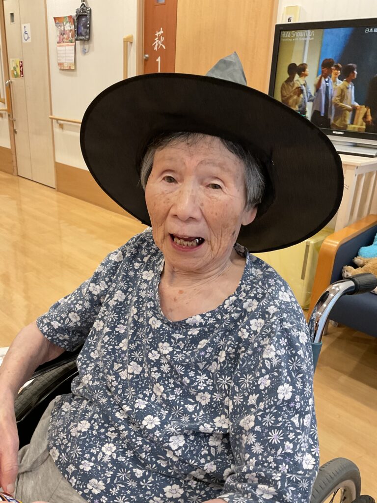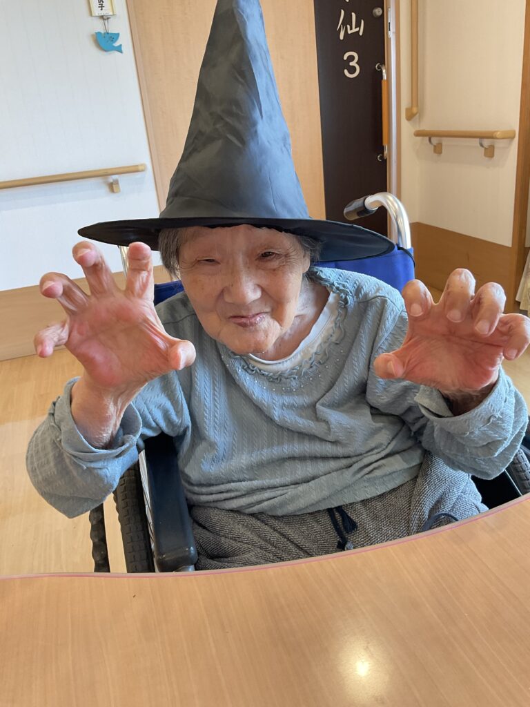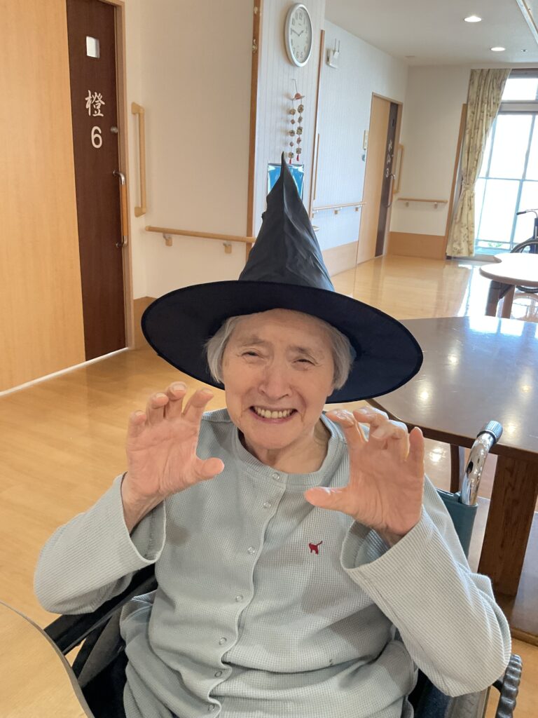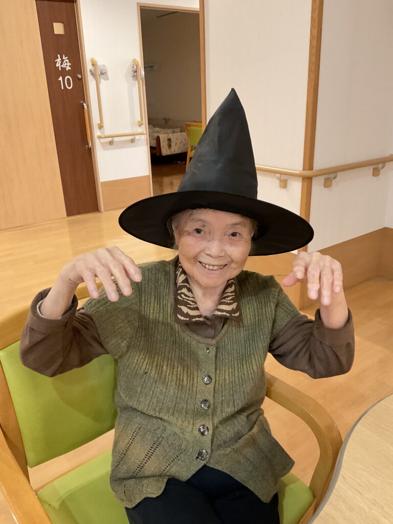 ハロウィンといえば「トリック・オア・トリート!」。職員が入居者様にこの魔法の言葉を教えると、皆さん興味津々。でも、いざ言ってみようとすると…