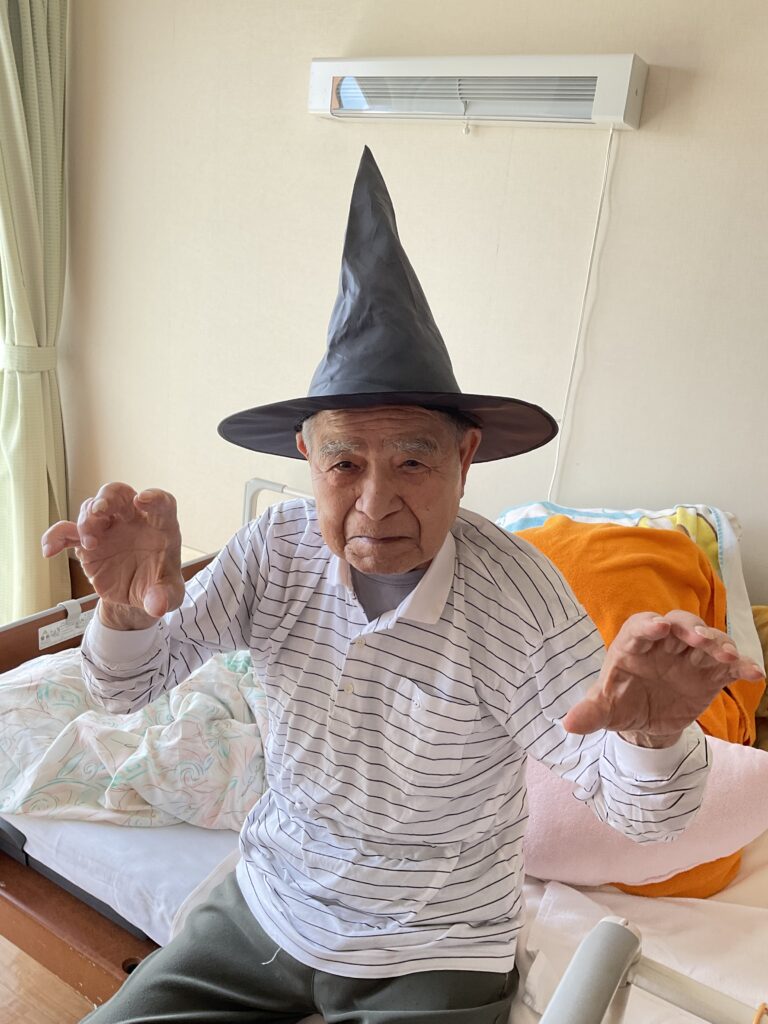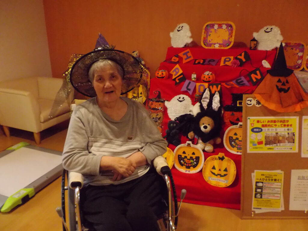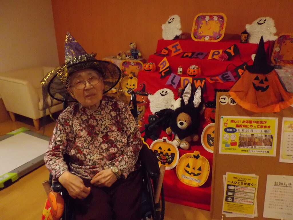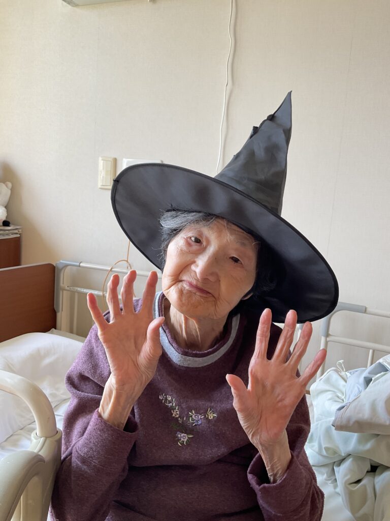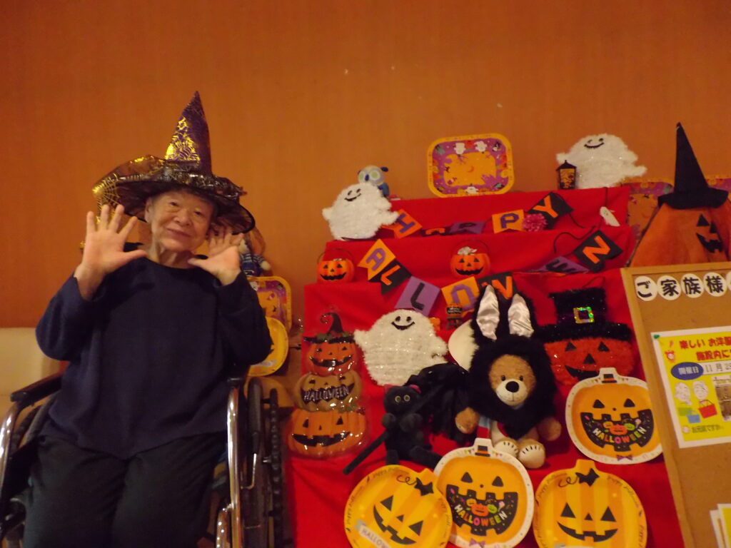 ハロウィンといえば「トリック・オア・トリート!」。職員が入居者様にこの魔法の言葉を教えると、皆さん興味津々。でも、いざ言ってみようとすると…