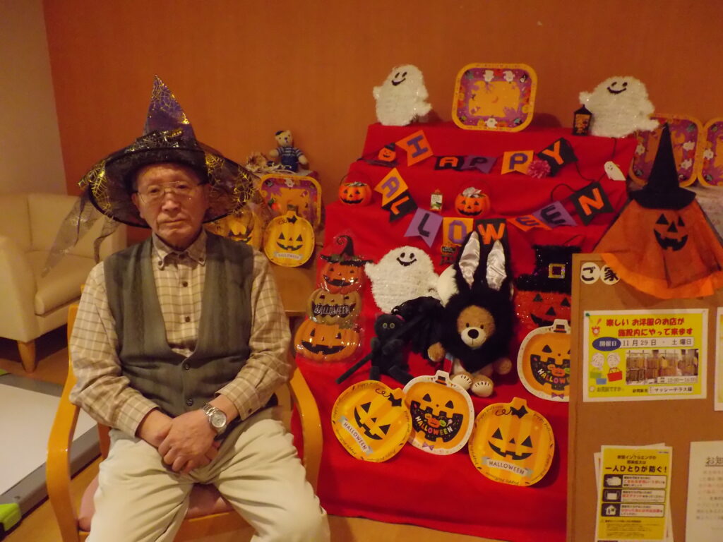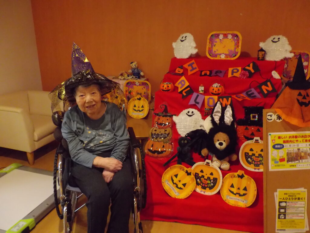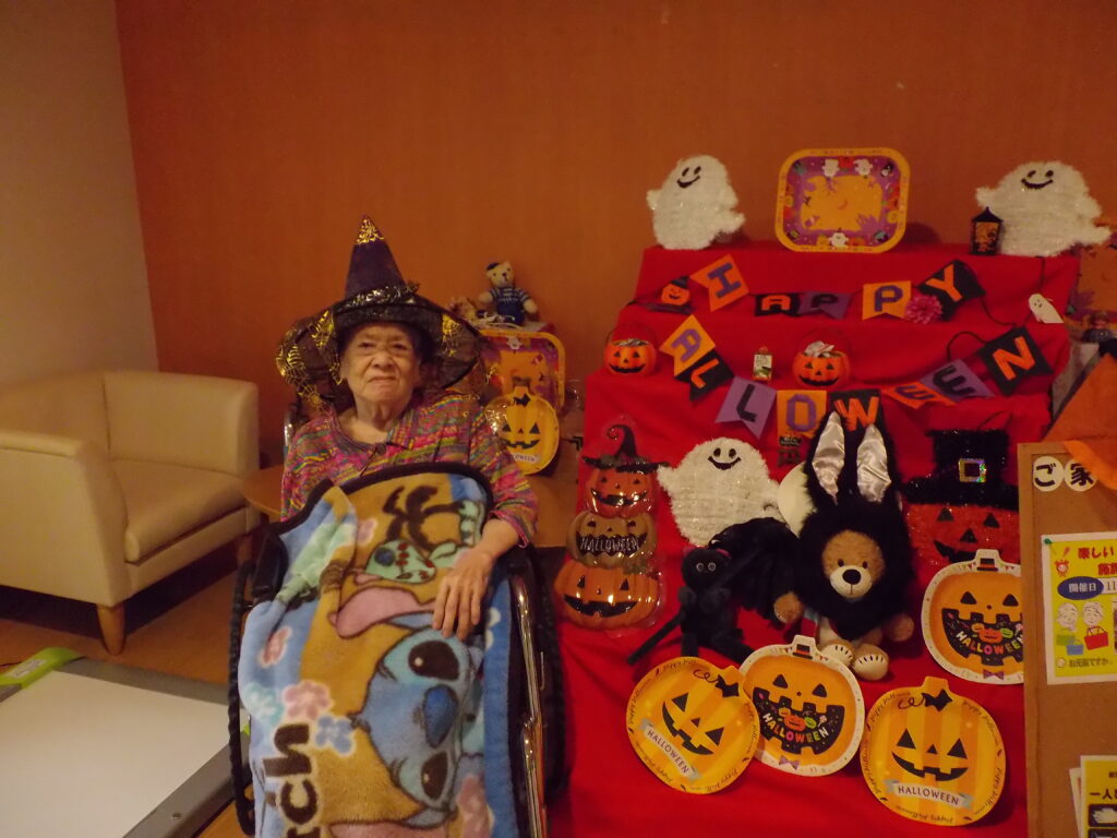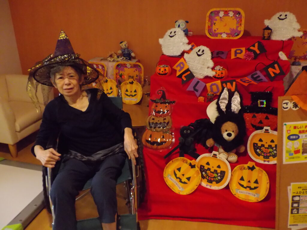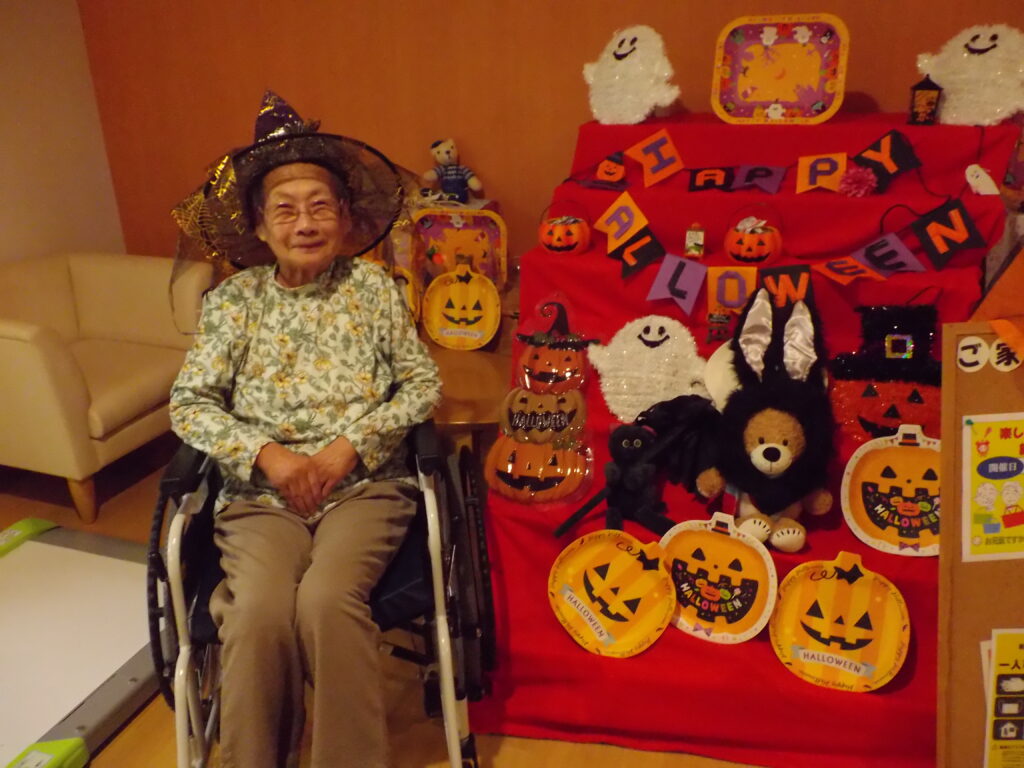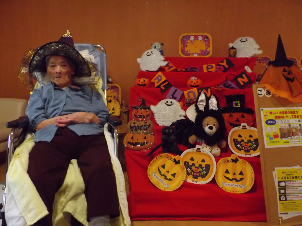 ハロウィンといえば「トリック・オア・トリート!」。職員が入居者様にこの魔法の言葉を教えると、皆さん興味津々。でも、いざ言ってみようとすると…