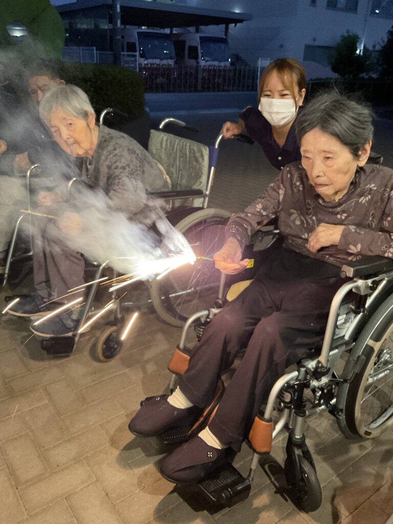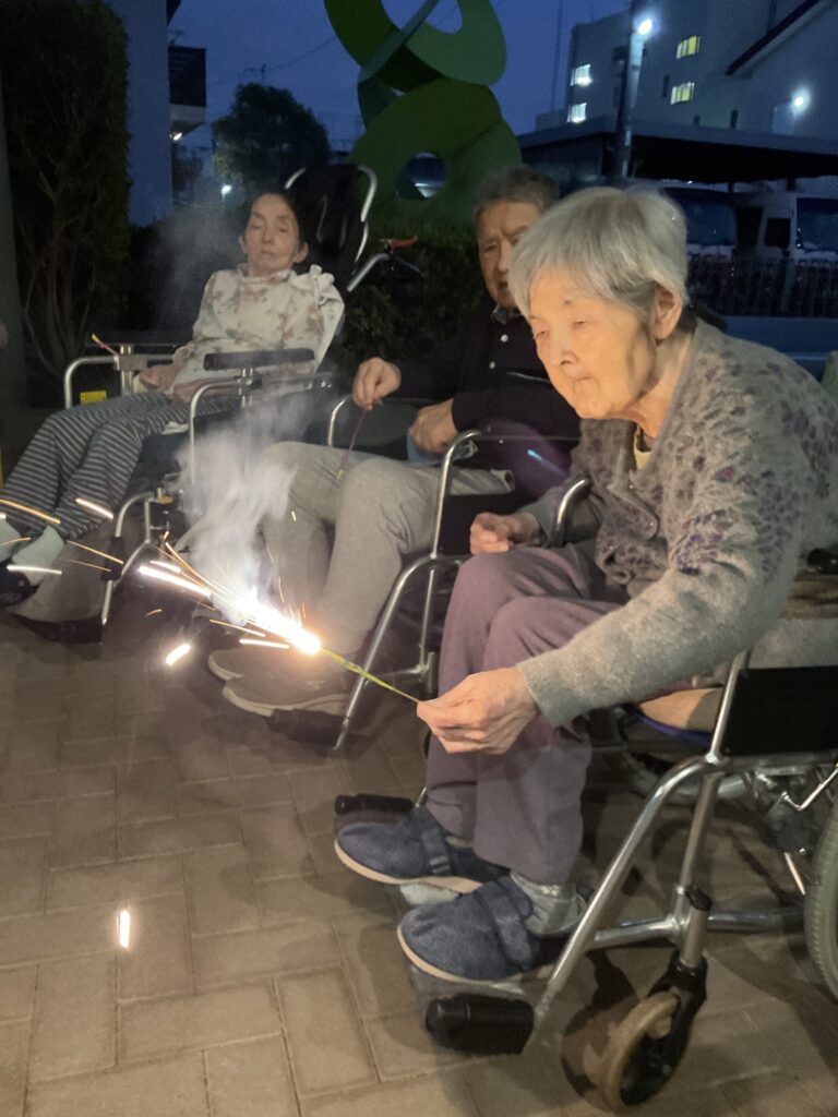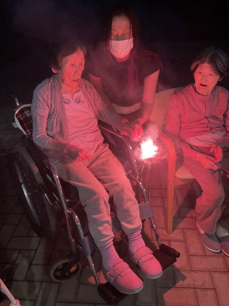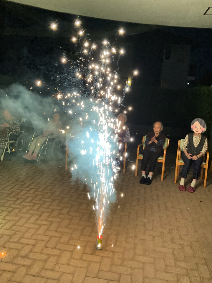職員も思わず手を止めて笑ってしまうほど、ユニット全体が一体となって楽しんだこの夜。打ち上げ花火こそありませんでしたが、皆様の笑顔と笑い声が夜空に響き渡り、まるで心に打ち上がる花火のようでした。