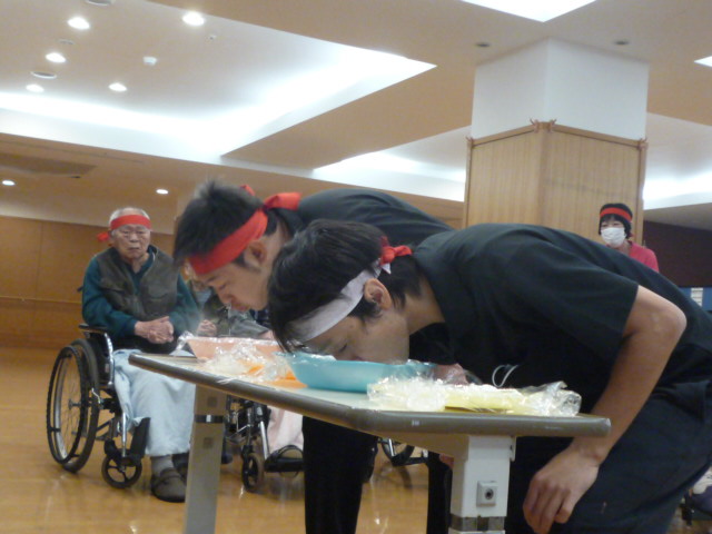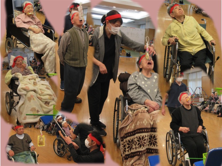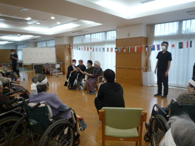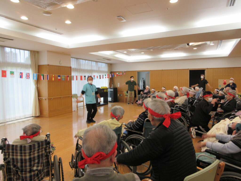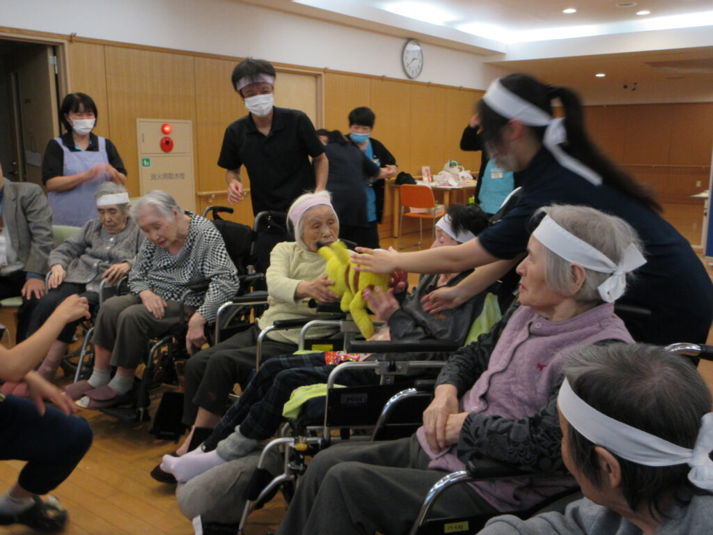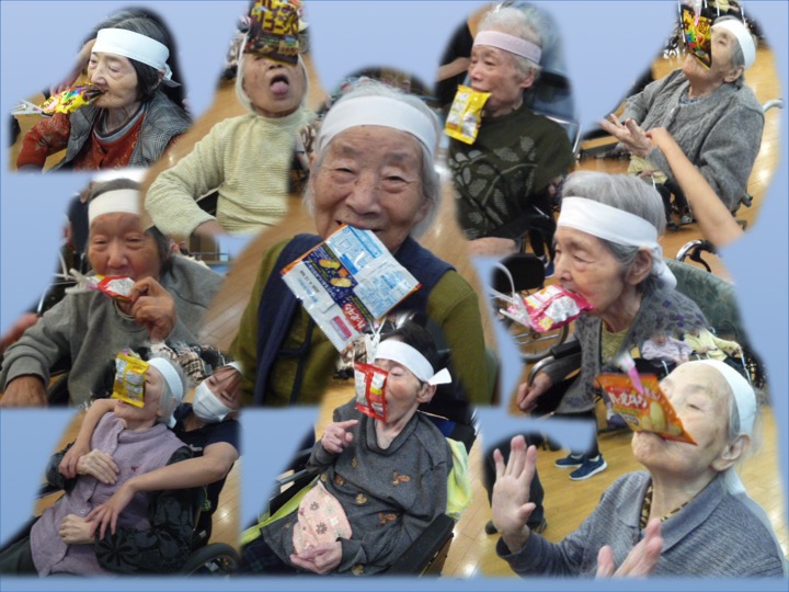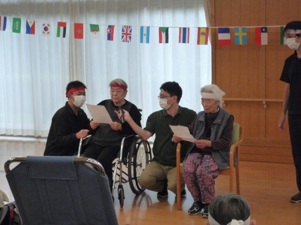 ある職員が顔を上げて飴玉をゲットした瞬間、白くなった顔のまま、なぜかカメラに向かって真顔でピースサイン!そのあまりの迫力に、笑いすぎて涙を拭う入居者様の姿も見られました。職員も体を張って笑いを届ける姿に、会場のボルテージは最高潮に達しました!