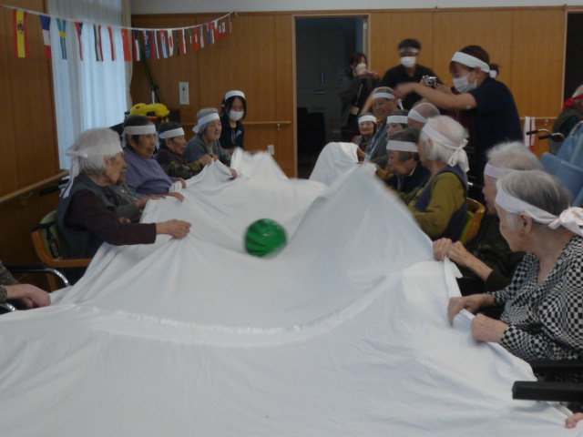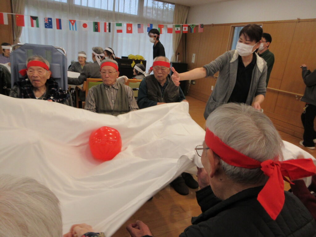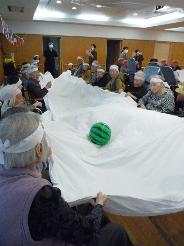 機能訓練士のアドバイスによる準備体操で体をほぐした後、最初の競技は**「シーツでボール送り」。 職員と息を合わせてシーツを持ち上げ、ボールを協力してゴールへ!力が入るあまり、ボールが相手のシーツの上に〜!、まさに「熱戦の証」**とも言えるハプニングもあり、会場は笑いに包まれました。