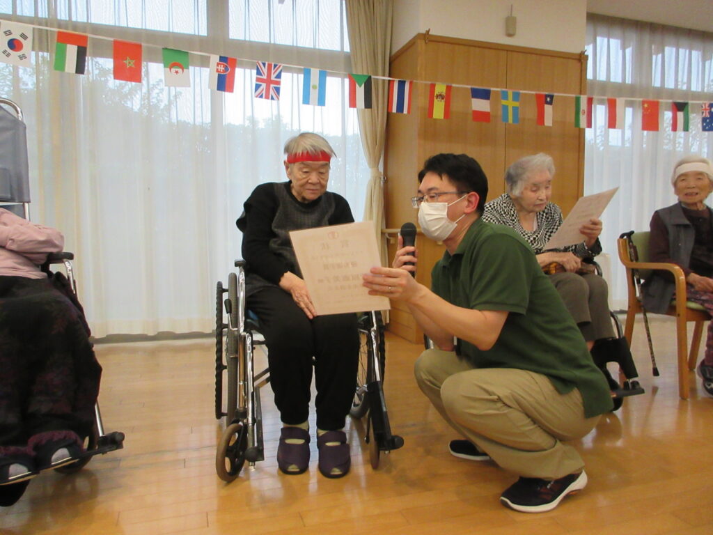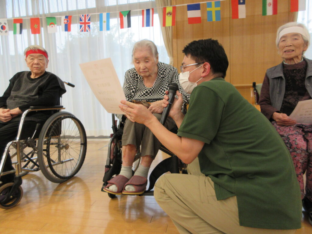 全競技を終え、最後は表彰式! 勝敗に関わらず、参加されたすべての入居者様に健闘を称えるメダルと賞状が贈られました。皆様の誇らしげな笑顔が、何よりの感動でした。