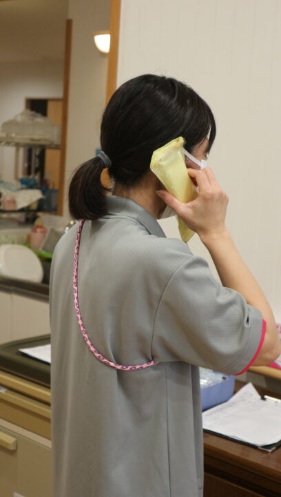 職員が仕事で使う電話をフックにかけて首から下げてます。落とす心配もないし、なんて言ったって私達のモチベーションも上がるのです!!
