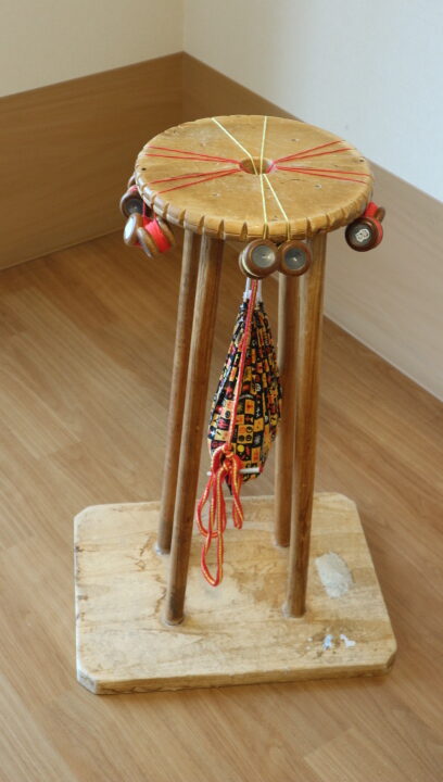 使用する台座は↓こんな感じ-。一見丸イスのようですが、円の淵には切れ込みが入っていて、ここに糸を交互に引っかけて組んでいくのです。