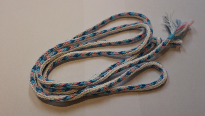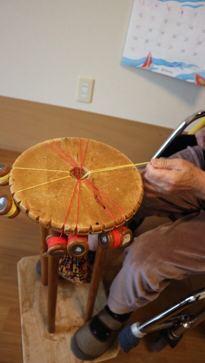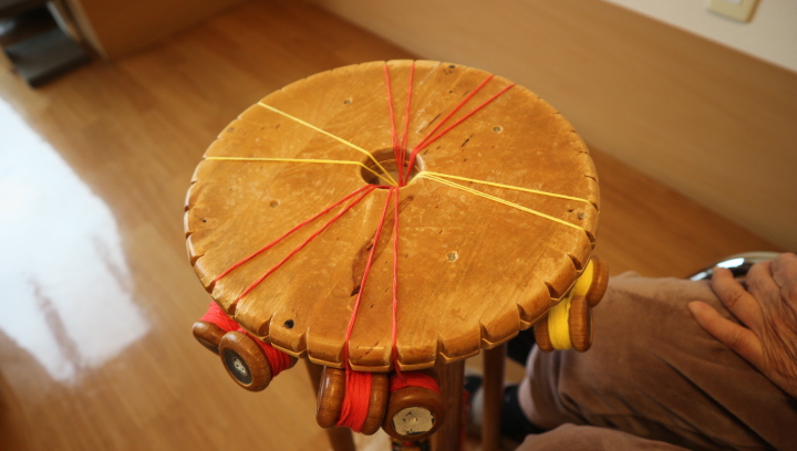 専用の台座に糸を掛けて交互に組んでいくと、糸が紐に変わっていきます。