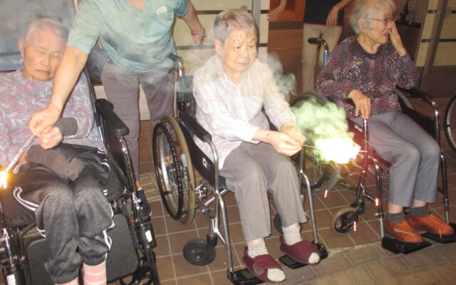 夏の日の思い出 遅くなりましたが花火レクを行いました。 夕方になり入居者の方々が外に出てきて、イスにすわってワクワク。職員が「はじまるよー!」と声をかけると、空に大き…